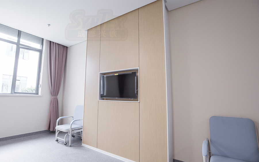 病房內(nèi)床頭板采用木紋表面的鋼制墻板,溫馨,又不失醫(yī)護(hù)功能。